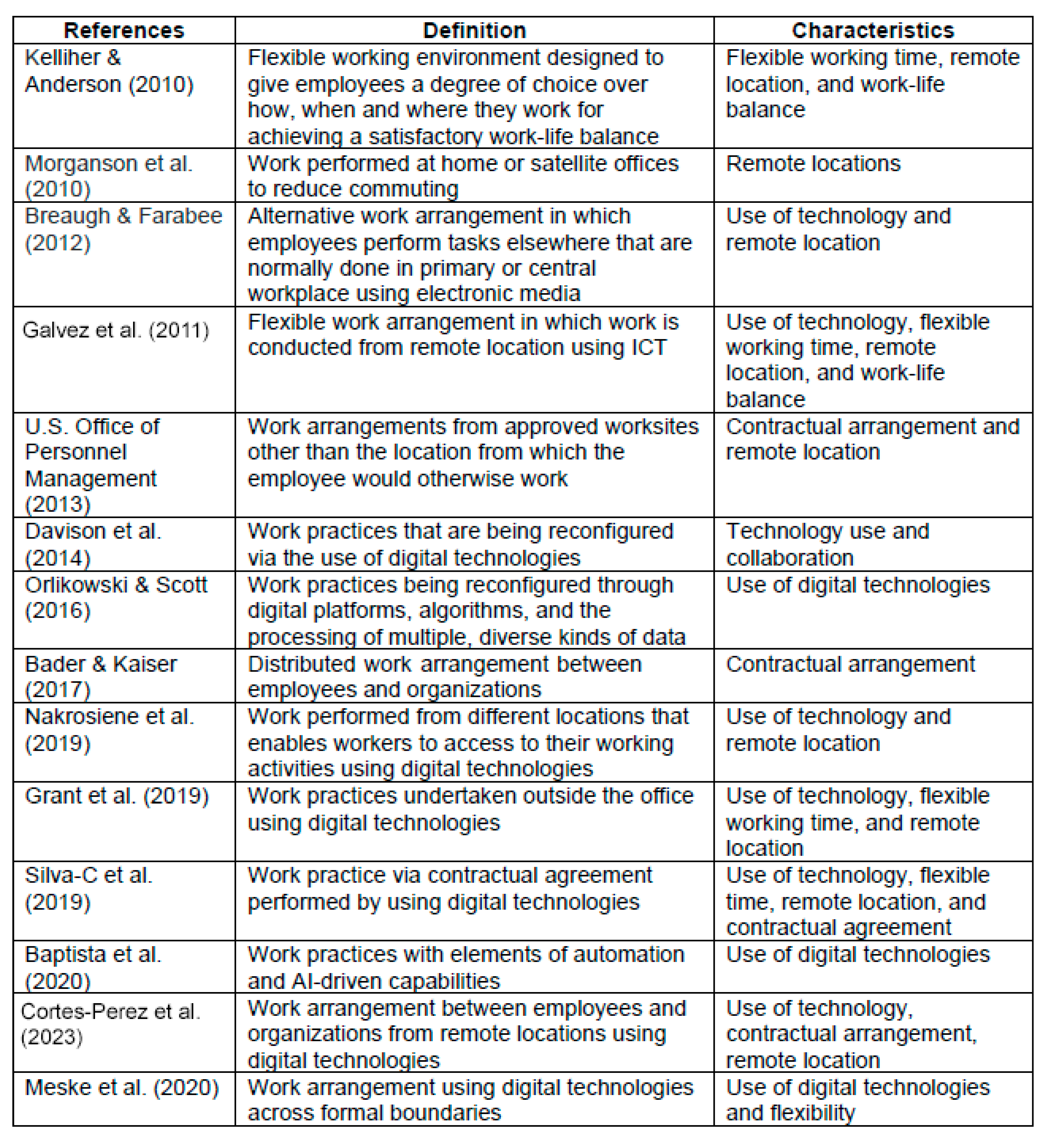 | [61] | Organisational digital work | Digital work systems | Conceptual ambiguity | Framework clarifies digital work. | Global; literature review | 2024 |