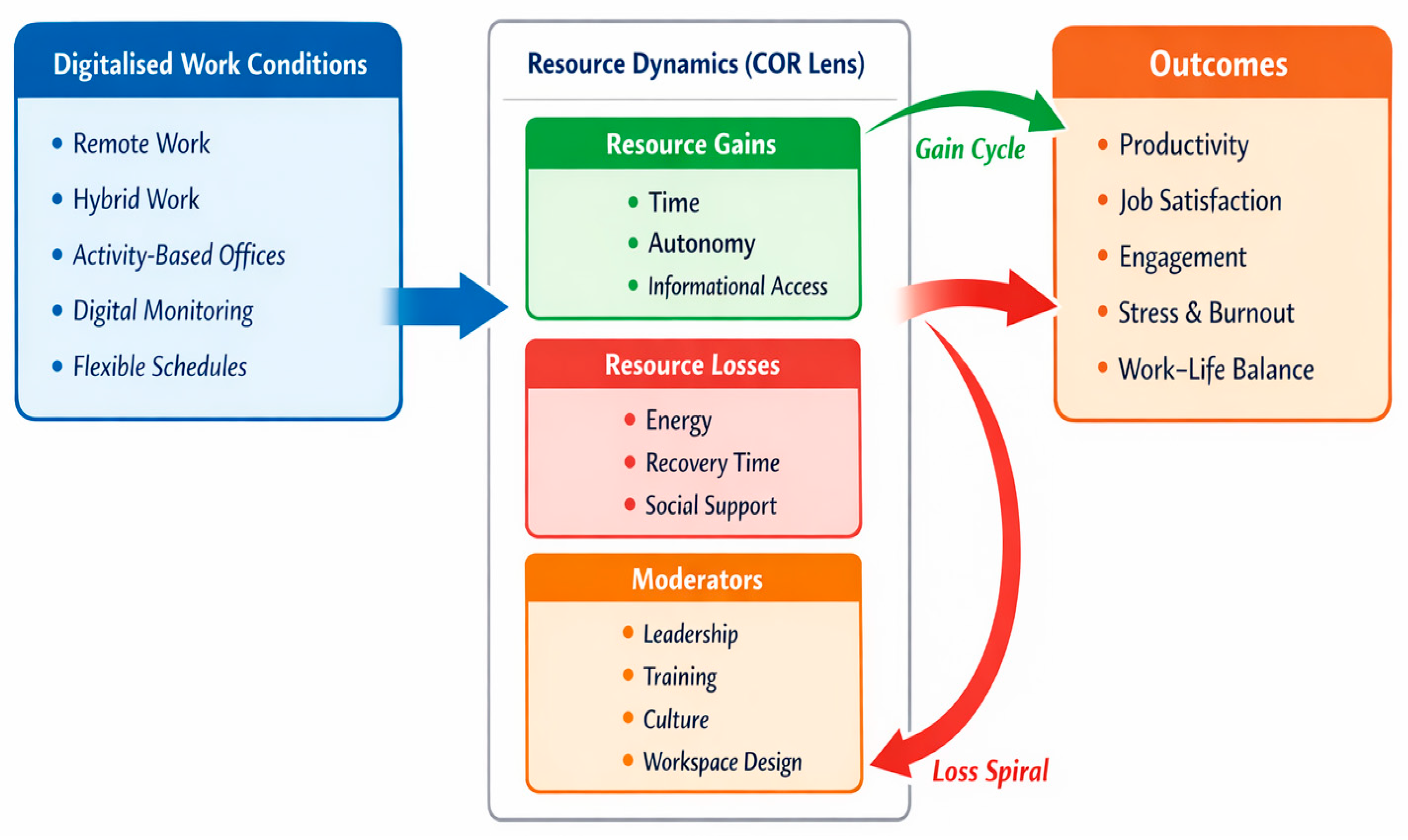 | Contextual Moderators and Resource Protection | Organisational context moderates resource trajectories: digital leadership, training, boundary norms, and workspace design buffer resource loss and enable sustained gain cycles, particularly for vulnerable groups. | Leadership support, skills, boundary clarity, psychological safety | [11,37,38,64,67] |