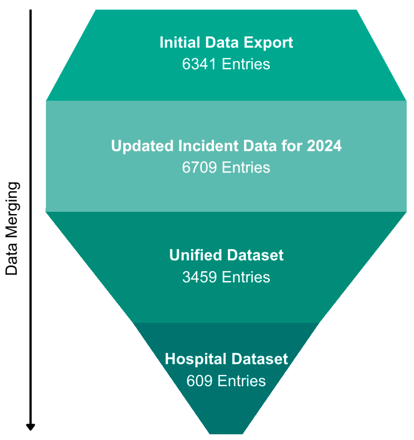 The merging process of our datasets is shown in Figure 1. After removing duplicates, we had 3459 entries remaining in the unified dataset and 609 (17.6%) in the hospital dataset.