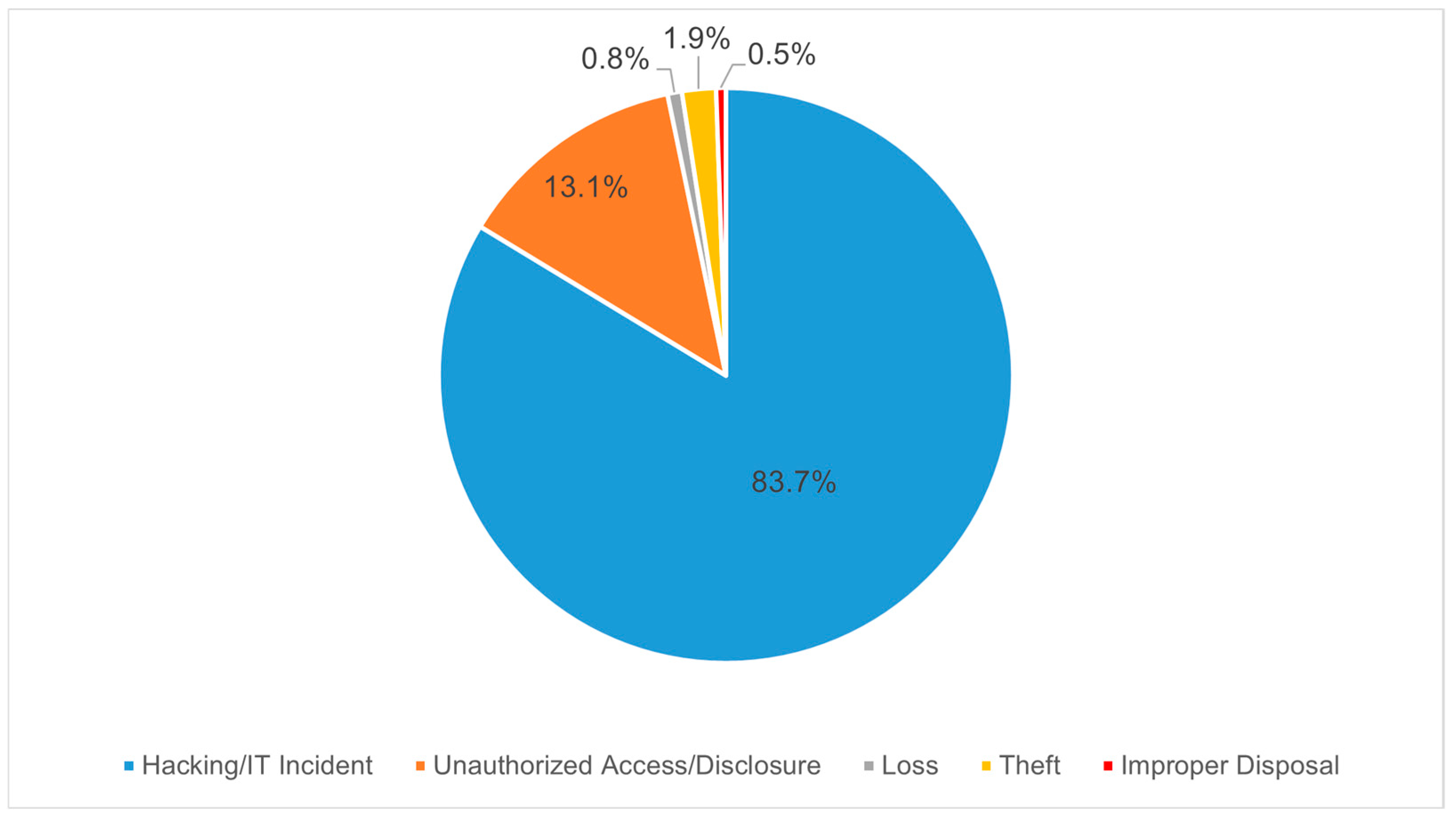 Looking at the distribution of main categories, on average between 2021 and 2024, most incidents (83.7%) were attributed to the “Hacking/IT Incident” category. “Unauthorized Access/Disclosure” (13.1%) also contributed to a significant number of incidents (Figure 2).
