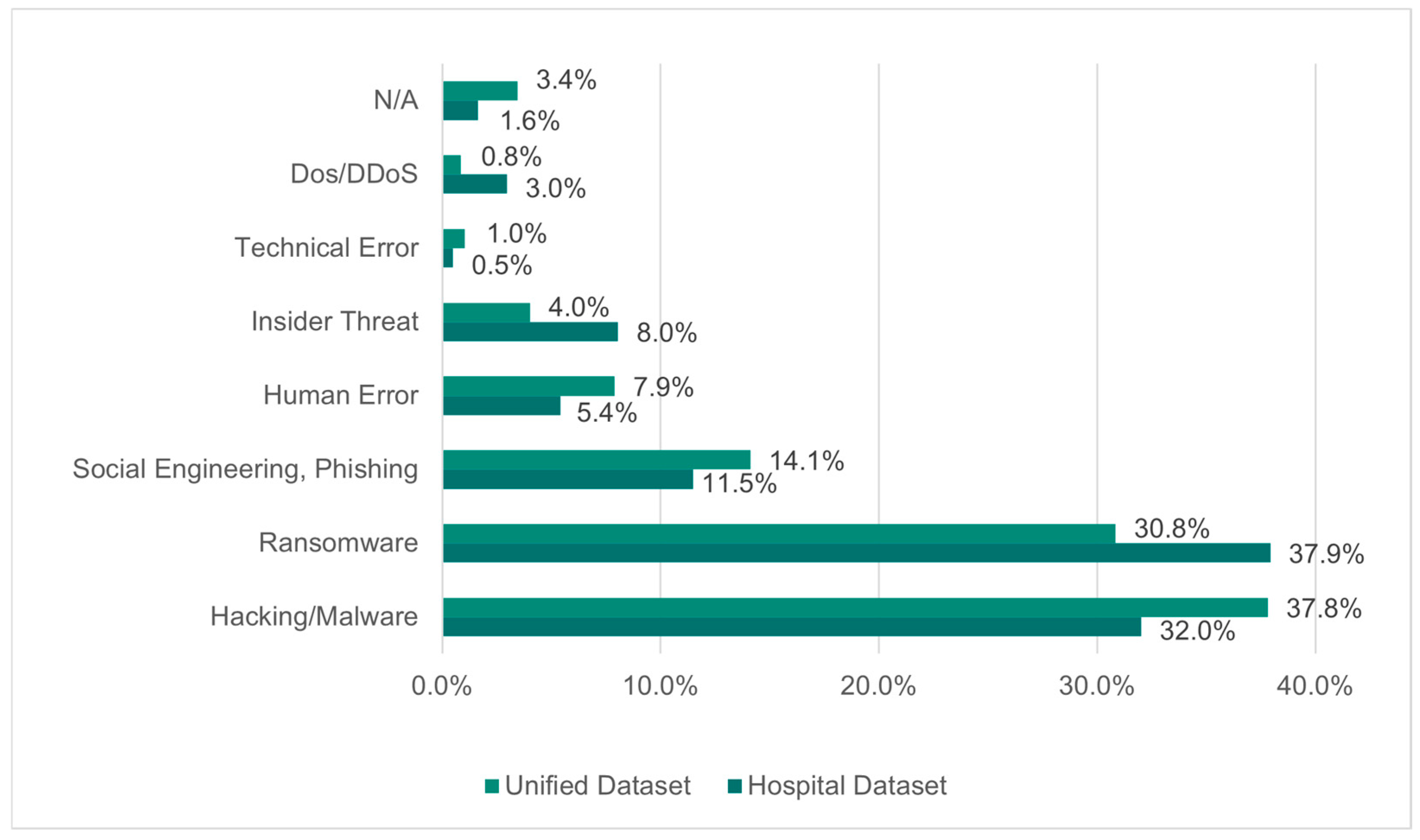 26.0% of incidents in the unified dataset and 24.9% in the hospital dataset were directly related to the human factor, categorized as “Social Engineering, Phishing”, “Insider Threat”, or “Human Error”.
