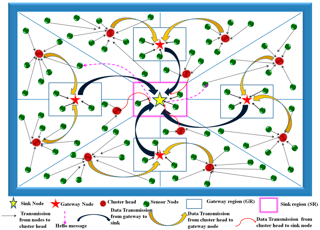 Sensors are distributed randomly over the surveillance area to accumulate some interesting phenomenon, like frequency of trembles in an earthquake-prone area or a change in the temperature of the area during the night. A gateway node acts as a central control system within two cluster regions. It initiates a request for accumulating the information. The gateway node broadcasts a control HELLO packet, and in reply, sensor nodes transmit their location information to the gateway. The gateway node calculates the distance of each sensor from itself and from the sink. If the sensor node is within the cluster region which is covered by the gateway node, it is in the range of the gateway node. The gateway node informs the sensor nodes about their region number by using their location information. It saves the resulting information into every sensor data table. The data table includes the sensor’s residual energy, identification number (ID), its distance to the sink and gateway, and its location information. In a hierarchical sensor network CHs are responsible for data retrieving, aggregation, and transmission. All sensors and the gateway node have information about the location of CHs; they send data or a query packet to CH directly instead of flooding the entire network with HELLO packets.