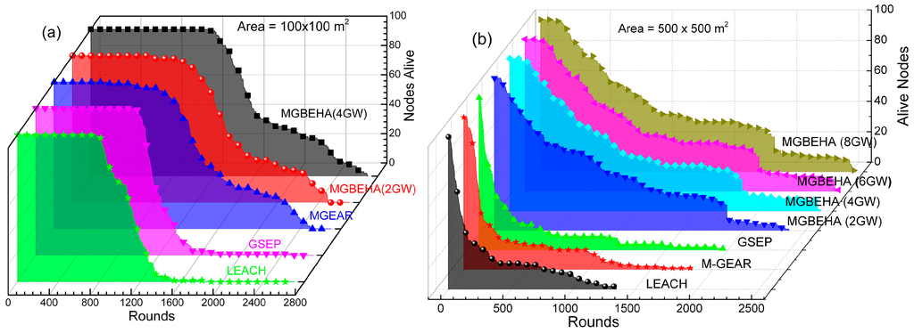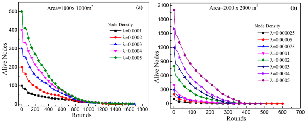 In order to test the efficiency of the protocol in very large areas, we have designed two scenarios, one with a 1000 × 1000 m2 area and another with a 2000 × 2000 m2 area. We have also analyzed the performance metrics for different node densities (λ = Number of nodes/area) in the area. Figure 9a shows the number of alive nodes in a 1000 m × 1000 m area. The maximum lifetime and the stability period of the network are approximately 1700 rounds and 10 rounds, respectively. A high node density does not affect the performance of the network. Figure 9b illustrates the effect of different node densities on the MGBEHA protocol in the 2000 × 2000 m2 area. The maximum lifetime in this area is 600 rounds. Node density does not have a significant impact on the lifetime of the network. Although the number of gateways has been increased in the network, the lifetime is reduced with an increase in the size of the area.