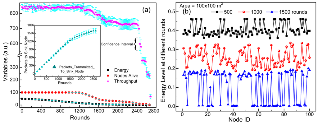 A variation in simulation results is represented by the 95% confidence interval and is shown in Figure 8a. In LEACH, energy holes can be created around the sink if large size clusters are formed near the sink. The energy of cluster members and CH will deplete with prolonged communication. Holes can also be created in remote areas if CHs are formed there, as CHs in remote area need more power to transmit data. The MGBEHA protocol avoids the energy holes problem as follows: holes cannot be created in the sink area, as nodes near the sink node do not transmit other node’s data and these are not involved in cluster setup phase, which further saves their energy. Similarly, holes cannot be created in a gateway region, as nodes here transmit only their data to the gateway and do not act as a relay node. Instead a gateway node acts as a relay node for CHs and reduces power depletion of the CHs.