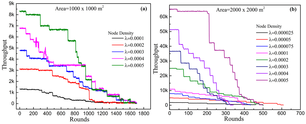 Figure 11a,b illustrates the total throughput of the network in a 1000 × 1000 m2 area and in a 2000 × 2000 m2 area, respectively. For a high node density, throughput of the network is very high, but it falls sharply in later rounds. Total throughput in a large area is much less than the throughput of the MGBEHA protocol in small areas.
