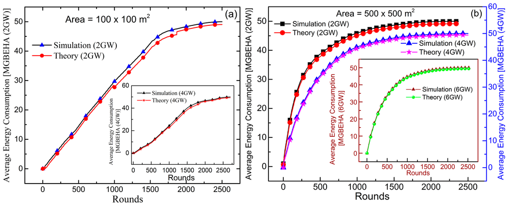 Figure 13a,b give the validation of simulation results against the theoretical analysis of energy consumption of the network for the MGBEHA protocol. According to the figure, our simulation results are very close to the theoretical results. It proves that average energy consumption of the network in the presence of different number of gateways. The number of alive nodes is directly related to the available energy in the network. The total number of packets transmitted to the sink and received throughput of the network depends on the number of alive nodes in the network.