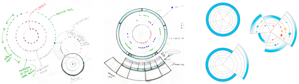 Figure 2 shows the development of the circular prototype idea. In a three-step procedure, we not only considered the layered hierarchy structure, but we also incorporated interaction approaches such as slicing the wheel or pop-up windows to display subinformation. Apart from creating interactions that can be adopted by analysts in this large control room environment, we used volumes and colors to reflect instant changes in network status and prioritize the issues with slice pieces in a circular prototype. Here it is noted that a circular prototype can contain interlinked dimensions of information while expanding to a substructured information platform, so we decided to use this changeable motion to connect to the user’s perception and action.