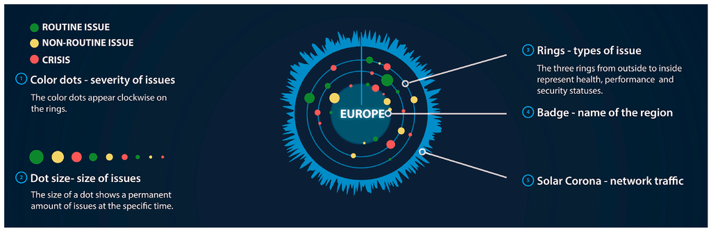 The final visualization design of a single SolarWheel (Figure 3) maintains consistent aesthetics and dark and light blue elements to construct a solar system background atmosphere. The whole display may contain many SolarWheels. Based on the requirements of this challenge [6], we decided that one SolarWheel should visualize the information dimensions of region, security status, health status, and network traffic.