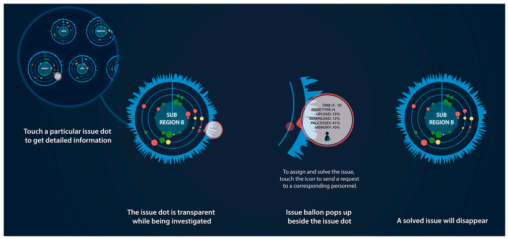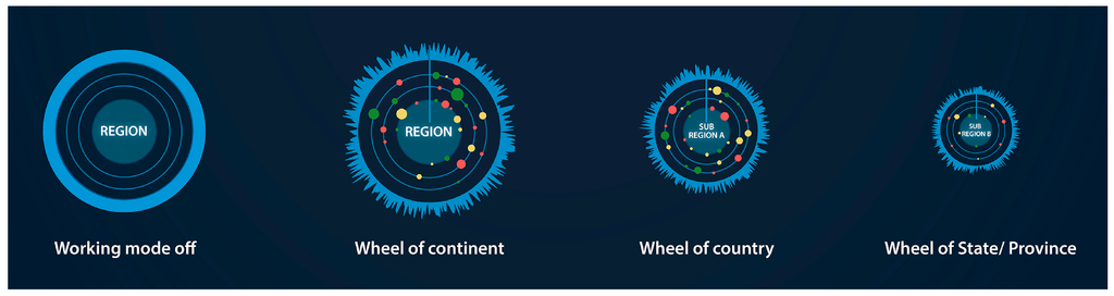 SolarWheels uses different sizes to show the network size of a region or subregion (Figure 4). At the overview level, each region is represented by one SolarWheel with the same color and motion but of different sizes and positions. One SolarWheel may be split into several smaller SolarWheels to represent its subregions. The SolarWheel graph makes use of the aforementioned metaphors while continuously and logically presenting the network data overview. Nevertheless, as we can see from the layout of the display screen, detailed information such as date, time, main analyst, number of resolved issues, and number of unresolved issues are placed at the top of the display to attract the user’s attention. Overall, the current design realized the design intents by helping users efficiently sense, read, understand, and interpret the network status data.