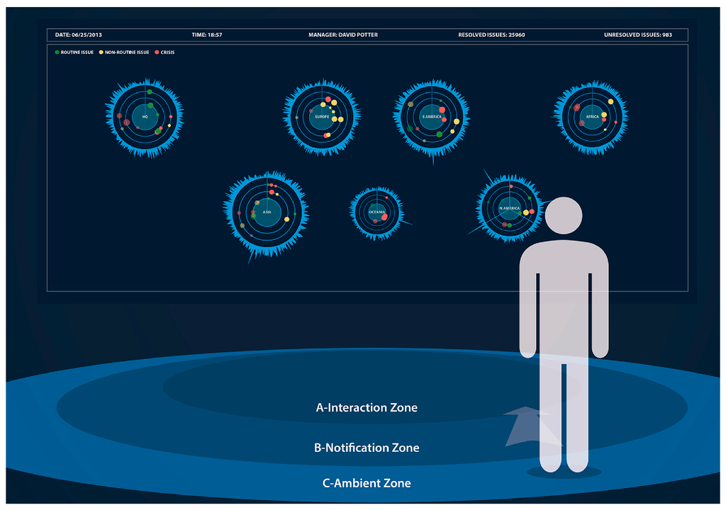 Our design outcome, SolarWheels, incorporates a large interactive screen and three communication zones—Ambient, Notification, and Interaction—to communicate different levels of information. It was set up in a collaborative environment that supports multiple-user interaction. Situated in a control room, network analysts can interact with SolarWheels either by stepping into different communication zones or touching the display. Determined by the user-display distance (detected by motion or proximity sensors), SolarWheels expands or collapses to show corresponding hierarchical layers of information: from informal to direct, implicit to explicit, and peripheral to focused attention.