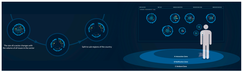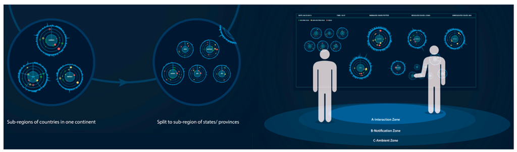 In this research project, we introduced an “affordance” perspective to evaluate the information visualization (InfoVis) and interaction design so that the user can more naturally engage with the system. According to product design literature [8,9], the concept of “affordance” focuses on designing from a user’s perceptive and considering the cognitive processes involved in adopting a product. Involved in these processes, of course, is the design of the product, its environment, and other related indications. An information display is set up in a particular environment that can provide behavior possibilities to satisfy a user’s expectations and potential needs. If the display is successful, its operation will be simple, convenient, and efficient. Pousman et al. [10] mentioned that an environmentally integrated approach to information display has intuitive appeal. Interaction is always considered an essential part of InfoVis. While modern InfoVis systems seek to combine design and technology to allow people see and analyze data in more efficient and intuitive ways, interaction design links a user’s perception, cognition, decision-making, and action with the data and context of use. Proper affordances provided by an InfoVis system will enhance the user experience with visualizations and their underlying data. When designing an InfoVis system, we should consider affordances from the perspectives of a system’s visual appearance, users’ interaction expectations, and the system’s reactions. SolarWheels focuses on direct interaction in a multiuser control room. Its design is a layered computer network coupled with communication zones. Driven by the intention of examining details from a certain point of interest, the user may wish to take a “closer” look and step forward, which will trigger the system to respond by showing more detailed point of interest (POI) information. Our integration of visualization design and interaction design aims to weave affordances into the cybersecurity awareness display system design.