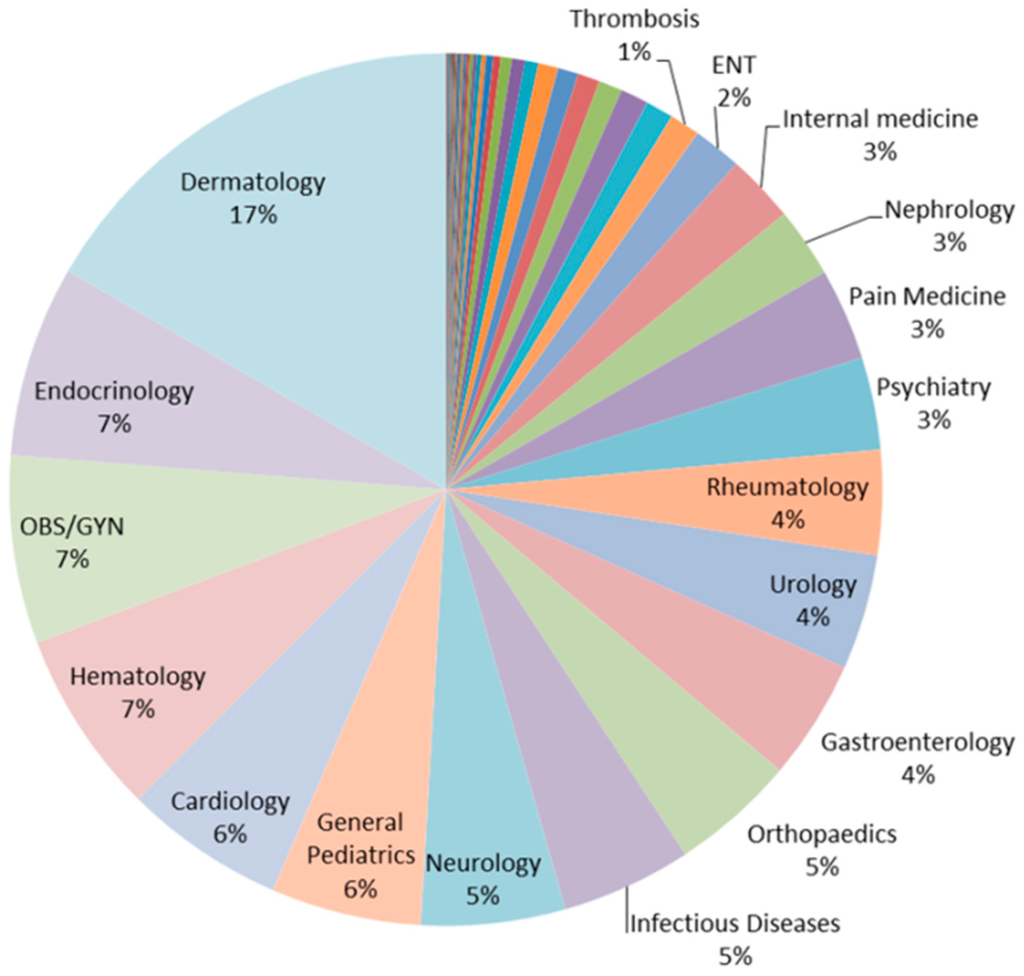 Figure 1. Specialty distribution for all cases completed between 1 April 2014 and 31 March 2015 (n = 3670). ENT = ears, nose, and throat; OBS/GYN = Obstetrics and gynecology.