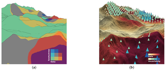 The analysis of geo-spatial data requires visualizing both the data and their spatial frame of reference [1]. The frame of reference is typically depicted as a 2D map, but for many applications, including applied geology, oceanography, or avionics, a 3D presentation of the terrain is needed [2,3,4]. Besides the spatial context, the interpretation of data strongly depends on knowledge about the data quality. Hence, visualizing the data’s associated uncertainty is another important objective [5,6,7]. Existing approaches usually consider only two out of the three aspects: either data in their frame of reference or data together with their uncertainty. Visualizing all three aspects, the 3D terrain, the data, as well as uncertainty information in a single comprehensible image remains an open question. Our work aims to fill this gap.