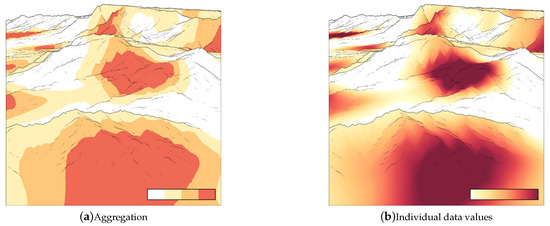 - Intrinsic encoding for : The idea of intrinsic techniques is to modify the existing visual elements. Common techniques are to use bivariate color maps, transparency, noise, or blur. Intrinsic encodings support qualitative assessments with about three or four distinguishable levels [30,43,44]. In Figure 4a, uncertainty is intrinsically encoded by modifying transparency. Higher transparency modulates the perception of color for uncertain data values, whereas colors in certain regions remain unchanged. This allows users to quickly grasp the existence of uncertainty, but not the precise degree of it.