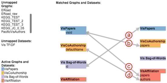 An actual mapping is performed dynamically, i.e., if a user clicks on a node in one of the network views or an entry in one of the additional bar charts. In Figure 3, the analyst declared four mappings between three graphs and the BoW index. The first mapping (see Figure 3a) from the BoW index to the papers network is used if a user clicks on a node in the respective network view. The application will then iterate through the BoW index, locate the row with the matching paper ID and fetch all terms used in that paper to show their BoW values in the BoW chart. As this mapping is bidirectional, the mapping will also be performed if a term is clicked in the BoW chart. In this case, the application will fetch all papers that use this specific term. The next two mappings (see Figure 3b,c) from the paper publications network to the co-authorship and affiliation networks are used to find related authors and affiliations for a clicked paper. The application will map the paper to all authors in the co-authorship network and affiliations that have the paper ID in their list of papers. The last mapping (see Figure 3d) maps an author’s name from the co-authorship network to the affiliation network, thereby enabling the user to find all affiliations a specific author wrote papers for and also to find all authors of a specific affiliation. Currently, our application only discovers matches between attributes with identical values. For instance, the last mapping (see Figure 3d) only finds completely identical strings between the configured attributes of the co-authorship and affiliation network. To be able to support fuzzy matching, we plan to extend the mapping feature in a future version. String similarities and configurable range values for numerical attributes could be used to find and display similar results.