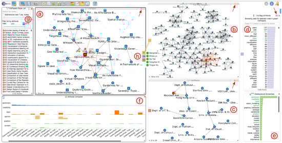 Graphs are visualized as interactive node-link views (see Figure 4a), whereas list-based datasets, such as the bag-of-words index, are shown as horizontal bar charts (see Figure 4d,e) due to space efficiency. The distributional similarity dialog (see Figure 4e) displays the most similar terms of a selected word in the related BoW chart. The attribute comparer (see Figure 4f) helps to compare quantitative attributes, such as the BoW values for instance, among a selection of nodes that can be added from any network view by performing a right-click on a node. It also supports sorting of nodes based on a selected attribute. The concrete processing depends on the network type in our case: if a node is added from the affiliation or the co-authorship network, the accumulated value from all papers for that affiliation or author is visualized, whereas a node from the paper network shows the actual BoW or TF-IDF value for that paper directly. If a node in one of the network views or an entry in the charts is hovered with the mouse, all related nodes or entries in all other views are highlighted, which helps to interactively explore the relationships between the datasets.