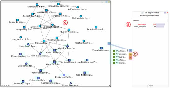 To create the concrete network views given in Figure 4, we started by searching for the term “sentiment” in the BoW chart (see Figure 5a). By clicking on the resulting term, the system matches the term over all configured networks and visualizes the result as three Hub2Go instances (see Figure 5b). In this case, the hubs show 34 papers, 166 authors and 21 affiliations that mention this term at least once. Hovering over the blue hub, which is related to the paper network, shows a list of all 34 found papers. Left-clicking the hub adds all nodes from the search result to the target network (see Figure 5c); or removes them, if they are already in the view. Alternatively, users could browse through the list and manually add or remove nodes of interest by left-clicking them. Going back to Figure 4, we also added all matching nodes to the other node-link views using our Hub2Go technique. Additionally, users can perform a right-click on a hub or a node in a hub-list to add all or specific nodes to the attribute comparer. In this case, we added all 34 papers to the attribute comparer (see Figure 4f) by right-clicking on the blue Hub2Go instance, and to analyze the occurrence of related terms among these papers, we also added “sentiment”, “credibility”, “topic”, “opinion”, “position” and “content” to the attribute comparer by right-clicking them in the distributional similarity dialog, which currently shows the most similar terms for the term “sentiment”.