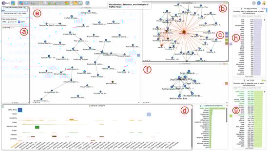 Integrating different network visualizations together with related multivariate data and helping analysts to discover relevant information, in the context of this paper by providing them with interactive possibilities to view and explore the relations between networks and large text corpora, is still an open challenge and has not yet been sufficiently addressed to the best of our knowledge. This approach is also important for other application domains such as biology, where the correlation of large metabolic pathways, protein-protein-interaction networks or regulatory networks is an important issue and the interconnections between various networks are not always obvious. Different networks come with numerous multivariate attributes (e.g., coming from experimental data), and exploring just one network and its related multivariate data is already a challenge in itself. This has been addressed by various techniques and tools; see the state-of-the-art survey of Kerren et al. []. Another survey for the visual analysis of graphs and open challenges in this area is provided by von Landesberger et al. []. In a collection of datasets (see the illustration in Figure 1), an attribute in one network might be related to other attributes in various other networks, even though they might not have the same identifier or name. To make interesting assessments about the data, analysts need to search for specific keywords, terms, authors or other metadata across different networks that might or might not be related.