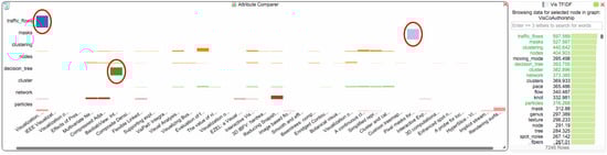 To answer Q2, the student investigates the TF-IDF chart, which shows the terms for all of van Wijk’s papers, as long as his node is selected in the co-authorship network. The student adds eight of van Wijk’s most used/important terms “traffic_flows”, “masks”, “clustering”, “nodes”, “decision_tree”, “cluster”, “network” and “particles” to the attribute comparer (see Figure 7) and right clicks the blue hub in the co-authorship view to also add van Wijk’s papers to the comparer. The student notices that the terms “clustering”, “nodes”, “cluster”, “network” and “particles” are used quite evenly throughout van Wijk’s paper collection. However, the other three terms are interesting outliers: “traffic_flows”, “masks” and “decision_tree” are each uniquely used in three different papers. In this case, the student discovers from the chosen terms that van Wijk addresses similar topics in most of his papers (in the case of the terms that are used evenly), but the three outliers could also indicate a broader research interest. The student could now further investigate and use the paper network view to open the links to the papers, and he/she could also use the TF-IDF chart to get an overview of the other terms that were used in those papers.