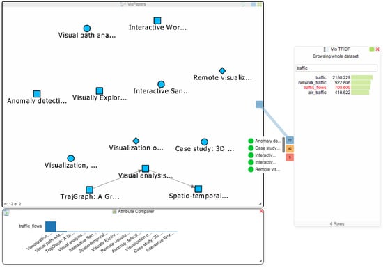 The student now decides to address Q3 and to find more papers about the term “traffic_flows”. Figure 7 already revealed that van Wijk only has one single paper that mentions this term, and searching for the term in the titles of all papers via the node list of the paper network also only reveals van Wijk’s paper. The addition of the BoW and TF-IDF indices makes it possible to search for terms in the data, rather than being limited to searching for keywords in the titles of papers. Therefore, the student can now find all papers that mention some specific term, regardless of whether it is in the title of the paper or not. To see if there are other papers in the dataset that use this term, the student clicks on “traffic_flows” in the TF-IDF chart and gets three Hub2Go instances linking to 12 papers, 42 authors and 9 affiliations (see Figure 8). After clearing the attribute comparer from the previous search queries, the student adds all 12 papers to the paper network and the attribute comparer using the blue hub. Van Wijk’s paper has by far the highest frequency of the term, but the student could now also open the other papers to see if they are relevant for his research.