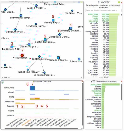 The TF-IDF chart now shows all values for the same focus paper ((7); currently selected in the paper network view) as in Figure 6. Adding all papers mentioning the term “traffic_flows” together with six related terms from the TF-IDF chart and the distributional similarities to the attribute comparer reveals five potentially interesting papers (1–5), which we added to van Wijk’s initial paper network view. Four of these papers are connected due to citations, and one of van Wijk’s papers (6) is also part of the resulting group.