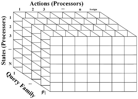 Let us focus on a single Q-table. Each Q-table has two dimensions. Rows represent the states of the world () and the columns represent actions () that the could take being at every state (i.e., a query family/type - assignment). This means that when the examines the possibility of assigning the query to a , it decides what action will take according to the values of the specific row of the Q-table. This decision could be the assignment (action ) or the transition to another that corresponds to the specific action and consists of the best choice being at the current state.