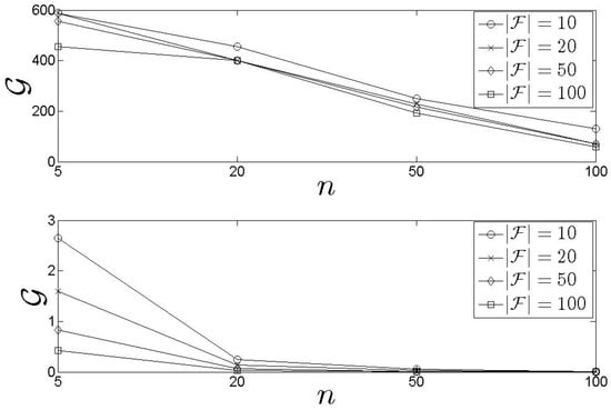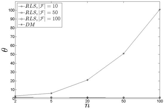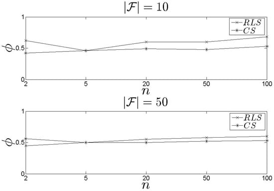 In Figure 13 and Figure 14, we present our results for the metric. We observe that the difference between the two schemes is significant with the exhibiting an average close to 0.10. In the case, the load of the selected s decreases as the n increases. For high n, the is based on an extensive set of data and, thus, can conclude an efficient s selection. The aforementioned results are not affected by number of families .