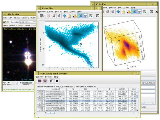 - Taylor, M.B. Visualizing Large Datasets in TOPCAT v4. In Astronomical Society of the Pacific Conference Series, Proceedings of the Astronomical Data Analysis Software and Systems XXIII, Waikoloa Beach Marriott, HI, USA, 29 September–3 October 2013; Manset, N., Forshay, P., Eds.; Astronomical Society of the Pacific: San Francisco, CA, USA, 2014; Volume 485, p. 257. [Google Scholar]