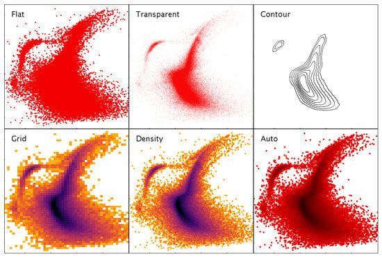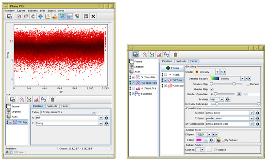 - Taylor, M.B. External Use of TOPCAT’s Plotting Library. In Astronomical Society of the Pacific Conference Series, Proceedings of the Astronomical Data Analysis Software an Systems XXIV (ADASS XXIV), Calgary, AB, Canada, 5–9 October 2014; Taylor, A.R., Rosolowsky, E., Eds.; Astronomical Society of the Pacific: San Francisco, CA, USA, 2015; Volume 495, p. 177. [Google Scholar]