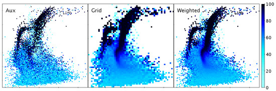Various representations of a 2-dimensional point cloud with a third dimension indicated by colour. Aux paints opaque coloured markers, which works for low-density regions, but at high density the appearance is noisy and depends on row sequence, since points painted later obscure earlier ones. Grid is a 2-d histogram weighted by the third coordinate; points in the same bin are averaged, but some spatial resolution is lost. Weighted is a hybrid density map/scatter plot but with pixel bins weighted by the third coordinate, providing clarity in both low and high density regions. The weighting combination method in the latter two cases is configurable; in this case the median has been used. Data are as for Figure 4 with the third coordinate indicating probability of cluster membership.