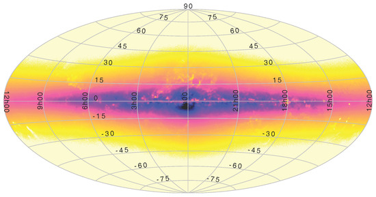 - Brown, A.G.A.; Vallenari, A.; Prusti, T.; de Bruijne, J.H.J.; Mignard, F.; Drimmel, R.; Babusiaux, C.; Bailer-Jones, C.A.L.; Bastian, U.; Elteren, A.K.; et al. Gaia Data Release 1. Summary of the astrometric, photometric, and survey properties. Astron. Astrophys. 2016, 595, A2. [Google Scholar]