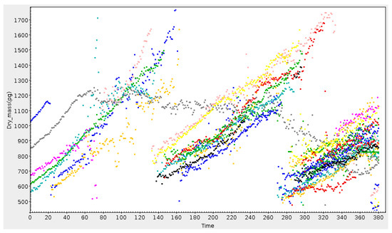 Growth and division of cells over time. Cell mass, represented by one colour for each distinct cell, increases until mitosis, when it is replaced by two daughter cells. In this plot the grey cell has become “blocked”, losing mass slowly instead of dividing. Credit: P. Pognonec, Université Nice.