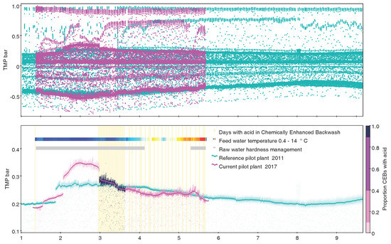 Time series (decimal month January–September) of Trans Membrane Pressure over two different ultrafiltration pilot plants in Gothenburg Sweden (7.7M rows). (Top) Two series of correct but noisy raw data, obviously not suitable for mean aggregations; (Bottom) Exactly the same data as top display, clarified by use of subsets, transparency, quantile smoothers, marking by auxiliary Y axis, histogram by time as event marking, and densograms for additional quantitative variable as well as operational information. Credit: H. Rydberg, Sustainable Waste and Water, City of Gothenburg.