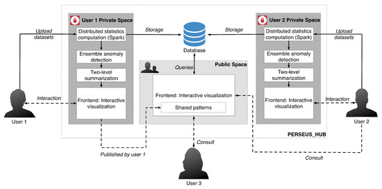 Overview of Perseus-Hub. The solid arrows indicate the system behaviors and the dashed arrows indicate the user behaviors. In this example, User 1 uploads the dataset to analyze to the private working space, and publishes it with marked patterns that he thinks are worth exploration. Other users who are interested in the published graph (User 2 and User 3) may refer to the analysis by User 1 in the public working space, or perform analysis in their private working space (e.g., User 2).