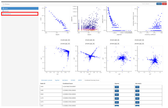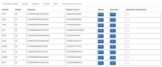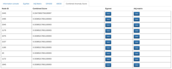 To explore nodes detected as anomalies, users can click on the G-FADD, ABOD, and Combined Anomaly Score buttons at the bottom of the screen to display the respective anomaly scores (Figure 8). Once the button is clicked, the top ten most anomalous nodes from the input graph will be presented in the table format ordered by their scores. Simultaneously, the top ten anomalous nodes are automatically highlighted in all the distribution plots to give the user a sense of the most anomalous nodes in their dataset (Figure 9). Node-specific interaction via egonet and adjacency matrix representation is supported for the anomalous nodes as well (through the tab for anomaly detection, as shown in Figure 8).