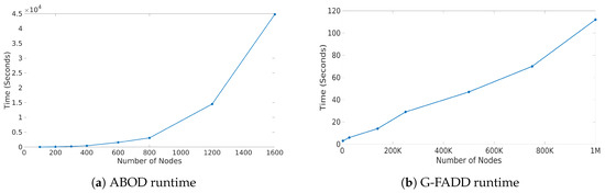 - G-FADD (Grid-Based Fast Outlier Detection algorithm given Duplicates [38]), a density-based anomaly detection method that is remarkably fast in determining outliers from multi-dimensional points with a large number of (near-) duplicates (i.e., points that have almost the same coordinates). Specifically, by considering identical coordinates in an n-dimensional space as a super node with their duplicate count information, G-FADD can compute anomalousness scores much faster than other density-based approaches such as LOF [37] (Local Outlier Factor), which do not treat duplicate nodes specially, and are inefficient at handling real datasets with many near-duplicate points. The time complexity of LOF is near-quadratic with respect to the number of duplicates, whereas for G-FADD it is near-linear.