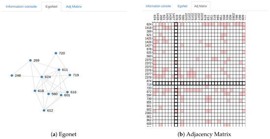 For each retrieved node in the information console, the user has the option to display the egonet and the adjacency matrix ( shown in Figure 7) of that node by clicking the appropriate button. Then, the user can navigate to the egonet and adjacency matrix tabs to view their respective interactive graphs. The egonet graph shows at most 10 other nodes adjacent to the selected node and all the connections between them. The user also has the ability to expand the egonet by clicking on any desired node from which they want to expand the network as well as deleting any desired node from the egonet. For efficiency, when a user clicks on a node, it expands to a random set of ten neighbors. However, this choice can be adjusted to better serve the exploration needs for different domains. The egonet (which is displayed using a force-directed layout) is interactive and can be re-positioned as desired by the user in order to provide a better visualization.