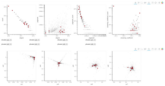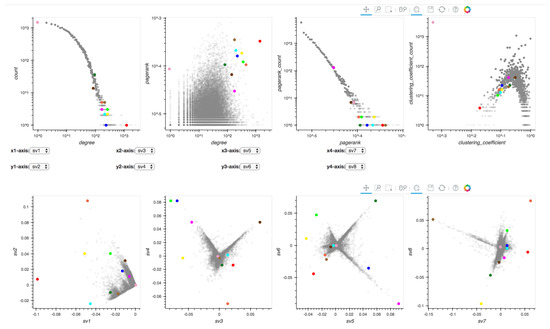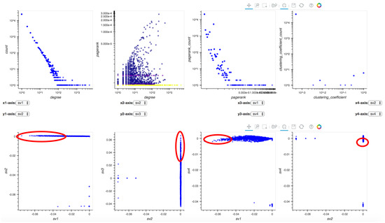 Univariate and bivariate distributions of node statistics are crucial for graph analysis, and are traditionally used for anomaly or spam detection in networks [35,41]. For example, the degree and PageRank distributions are expected to follow a power law [42], while singular vectors exhibit the “EigenSpokes” pattern [43] that can be used to explore the community structures.