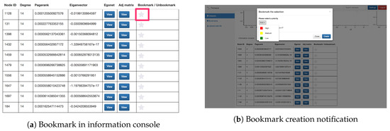 - Bookmark module: The bookmark feature allows users to mark a specific node within a dataset by clicking on the “star” button next to the statistics in the information console. This feature gives users a finer-grained choice to mark their interest, e.g., a specific point in social networking datasets. Moreover, users can set a priority flag for their bookmarks, enabling better categorization and recognition for the creator. For collective analysis, users can choose to share their bookmarks publicly so that other analysts can incorporate these findings in their exploration process. Screenshots of the bookmark button and bookmark creation are shown in Figure 10.