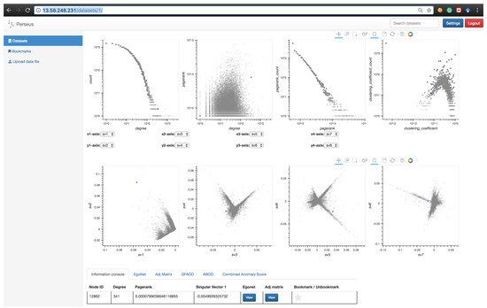 Perseus-Hub provides three components to explore a specific point in a distribution (or correlation) plot: (1) an information console revealing the details of a collection of nodes that are similar to the a user-selected node in terms of at least one statistic (e.g., similar degree); (2) a dynamic egonet representation; and (3) an adjacency matrix centering a specific node. In addition, users who are interested in system-detected anomalies can explore the corresponding nodes using the provided anomaly detection methods.
