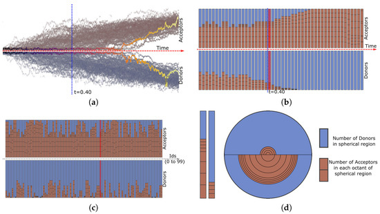 - Morphology Composition plots—Through these plots the morphology composition (acceptor-donor ratio) can be investigated. It displays the acceptor-donor material ratio in the neighborhood surrounding a charge. For a single trajectory, the ratio is plotted for the entire transportation (Figure 7b). For ensembles, the morphology ratio at a specific time (Figure 7c) is plotted. The acceptor-donor ratio is computed for a spherical region. The spherical region is divided into eight octants illustrating the distribution in each octant. (Figure 7d).