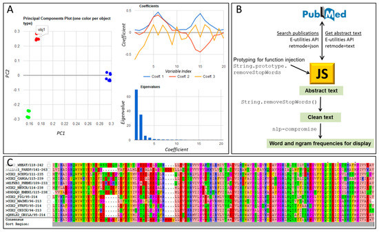 Tools for data analysis and visualization. (A) Outputs from the tool for principal component analysis (https://lucianoabriata.altervista.org/jsinscience/pca/pca3.html) run on a collection of 21 objects of three types, each described by 20 variables. Singular value decomposition of the 21 × 20 matrix is performed with LALOLib. Google Charts is used to display a scatter plot of the 21 objects mapped on the two first principal components, line plots of the contribution of each variable to each principal component, and bar plots of the eigenvalues to measure the fraction of variability explained by each principal component; (B) Diagram depicting how to search, retrieve and analyze PubMed abstracts with JavaScript (https://lucianoabriata.altervista.org/jsinscience/texts/textworks.html). A query through Eutils API retrieves articles in JSON format; then, further calls retrieve their texts. Abstract texts are processed with a function prototyped into the Script class, which removes stop words (these are irrelevant words that would confound further analysis). The cleaned text is then processed with nlp-compromise to calculate frequencies of words and n-grams (word pairs, triplets, etc.); (C) Example interactive visualization of an alignment of PFAM seed members for COX2 (PF00116) with JSAV [3], achieved through the demonstration webpage at http://www.bioinf.org.uk/software/jsav/.