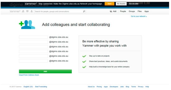 In this “connected age” [], technologies that enable connectivity have demonstrated their potential to benefit education at different levels and in different areas. In light of the connectivism theory [], digiMe was developed with an aim to promote collaborative and peer supported learning. Connectivity to peers was valued by digiMe users. While this reflection is not significant in the participants’ self-reported usage of the digiMe community social/professional networking tool, Yammer, it is evident in the Google Analytics reported digiMe app usage, which indicates that Yammer was amongst the more popularly used apps. It can be said that this project to some extend helped enhance an awareness of the potential of digiMe, as an example of Web 2.0 supported websites, in building connective and collaborative learning and practice. At the same time, the value of connectivity was evident in the participants’ comments which referred to connection to peers via Facebook since early years in their course. This is also demonstrated with 40% (n = 26) of the participants using social networking tools, like Facebook, six or more times per week. This active and spontaneous adoption is also observed in other studies [,].
