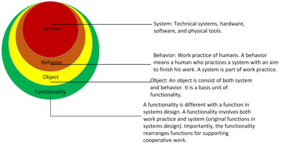 The model is built up as follows: first, we acknowledge that “technology” refers to the use of artifacts in practice [68], and a technical system is part of cooperative work [69]. In line with this, functionality is a component of cooperative systems that includes at least one object. An object consists of both the technical system and human behavior. A cooperative system may start as a technical system, but it can become an object when systems developers incorporate cooperative work into systems design. The behavior in the model involves the interactive relations between operators, systems and tools. An ‘object’ is equivalent to a ‘computational artifact’, but here it is termed differently to distinguish CSCW research from systems design (see Figure 3). From a systems design perspective, functionality is a connection of objects consisting of interactive relations and the connections between them if we see an object as a part of a cooperative system.