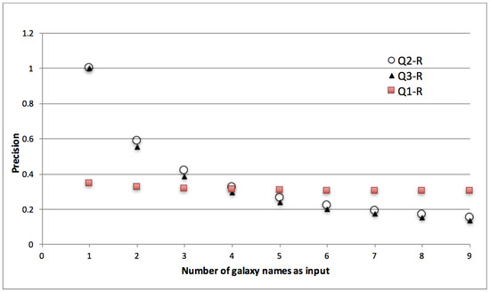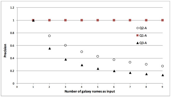 As part of our case-based validation we implement queries as node selections and traversals over generic versus annotated provenance graphs. We use the “-G” and “-A” suffixes with query names to denote the nature of provenance they are run on. We measure query result precision as follows. To understand the utility of provenance for reporting we differentiate between True Accuracy vs. Lineage Accuracy of results to a query. All results obtained to all our queries (expressed as intentional rules over our formal model) has 100% Lineage Accuracy. Meanwhile these results may not have True Accuracy. A result has True Accuracy if it falls in the scope implied by the query (e.g., for Q1 the results that actually contain coordinate data that is retrieved from the Sesame database, not the results computed using those coordinates or their descendants. Or for Q2 the results that actually contain data belonging to galaxy M31 but not galaxy M32 and so on). In Figure 6 We present the True Precision of results, which we define as: