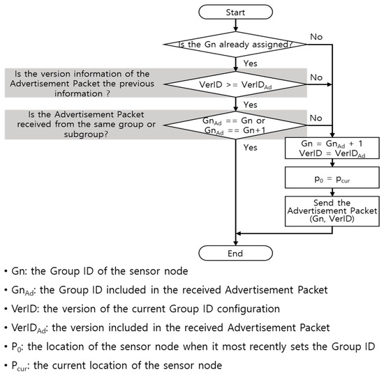 For initial group ID setting, the “Advertisement Packet” is used. The sink node generates the Advertisement Packet that includes its own group ID (the sink node’s group ID is 0) and the version information for initial group ID setting, and then this packet is transmitted to every smart sensor node around the sink node.