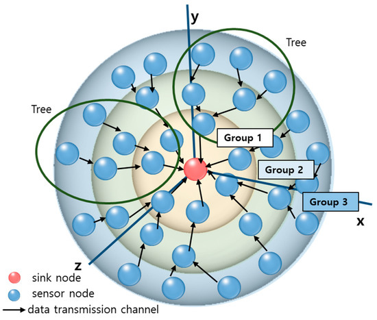 Figure 3 shows how the data of smart sensor nodes are transmitted only in the direction of the sink node. It shows that smart sensor nodes are arranged, centering the sink node in the 3D space. In the x axis, y axis, and z axis of the 3D space, it is assumed that the sink node is located at the position of (0.0.0), and each smart sensor node has its specific location value in the x axis, y axis, and z axis. This paper explains and simulates the concept of arranging sensor nodes in the three-dimensional space by means of the x, y, and z axes. In actual system, however, it is also possible to values sensor nodes’ latitude, longitude, and height above sea level values. When latitude, longitude, and height above sea level values are utilized, however, there might be some difference from the actual position and thus additional research is necessary to address this problem. When every sensor node is given a group ID, it is possible to group sensor nodes based on sink nodes. In Figure 3, the group ID of sensor nodes within the yellow circle is 1, that of sensor nodes within the green circle is 2, and that of sensor nodes within the blue circle is 3. Black arrows indicate that a sensor node sends data to the closest sensor node in the upper-level group. For example, a sensor node in Group 3 sends the closest sensor node belonging to Group 2. As the black arrows lead up to the sink node, the path of data transmission is indicated. The data transmission channel up to the sink node is of a tree-shaped structure. The dark green circle in Figure 3 shows an example of a data transmission channel of a tree-shaped structure.