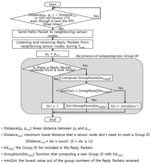 Figure 5 shows how smart sensor nodes trying to reset the group ID transmit the Hello Packet, receive the Reply Packet, and set a new group ID. When the Reply Packet has been received from the sink node, smart sensor nodes belong to group 1 and thus the group ID becomes 1. Otherwise, a new group ID is calculated by means of the GroupNum() function in reference to the group ID information in the Reply Packets received by smart sensor nodes. The GroupNum() function may be expressed with Formula (2) below. Since it is possible to send data only when the one-step upper level group exists within a distance where communication with smart sensor nodes is possible, the group ID value must be larger than the minimal value of the group IDs received from other adjacent nodes. Thus, if the value calculated by GroupNum() is larger than the minimal value of the group IDs in Reply Packets, a new group ID needs to be set based on the value of GroupNum(). Otherwise, the group ID becomes a value that is the minimal value of group IDs in the Reply Packet + 1.