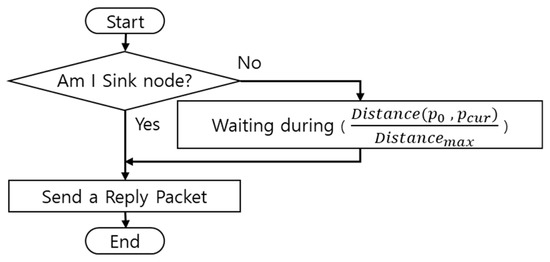 Figure 6 shows the process that a smart sensor node receiving the Hello Packet transmits the Reply Packet. When a sink node receives a Hello packet, the smart sensor node that receives it should set the group ID to 1 and the sink node transmits a Reply packet. A smart sensor node that is not a sink node transmits a Reply packet after a time corresponding to the distance of its movement after receiving a Hello packet. In this manner, the smart sensor node that resets the group ID can receive a Reply packet including a group ID of high reliability earlier than others.