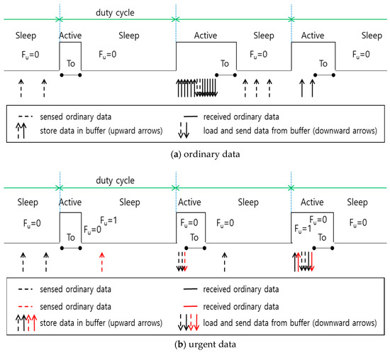 Figure 7b shows how to send urgent data. When there is a data set whose Fu value is 1 among collected data, the smart sensor node recognizes the data as urgent. In this case, the smart sensor node in the active mode sends all the data saved in the buffer regardless of the buffer threshold. As shown in Figure 7b, when the smart sensor node senses the first urgent data set, Fu is set to 1 and the urgent data are saved in the buffer. In the second active mode, three sets of data are saved in the buffer, and the size of data is smaller than the buffer threshold. However, the smart sensor node transmits all of the data in the buffer to the smart sensor node of an upper-level group, and the value of Fu is reset to 0. Likewise, as the data set received from the last active mode includes urgent data, the value of Fu is reset to 1, and the smart sensor node transmits all of the data immediately to the smart sensor node of an upper-level group regardless of the buffer threshold.